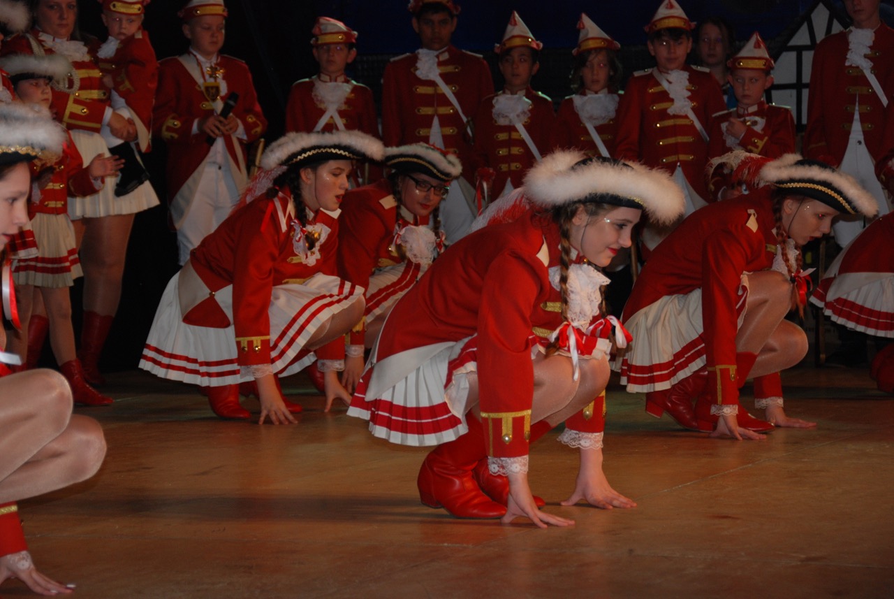 Das Knübbelchen des Traditionsvereins war heute am 4. November 2017 zu ihrem ersten Auftritt der Karnevalssession 2017/2018 in Palmersheim aufmarschiert. Fast vollzählig angetreten präsentierten die Mädchen und Jungs im Alter zwischen zwei und 18 Jahren ihr Können vor dem Publikum. Auf anfänglicher Nervosität folgte alsbald ein großartiges Bühnenbild in Weiß und Rot. Ein wahrer Flohzirkus, für den die Bühne schnell zu klein wurde.