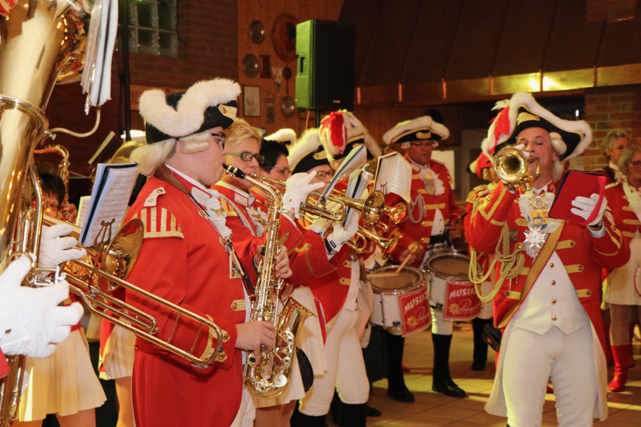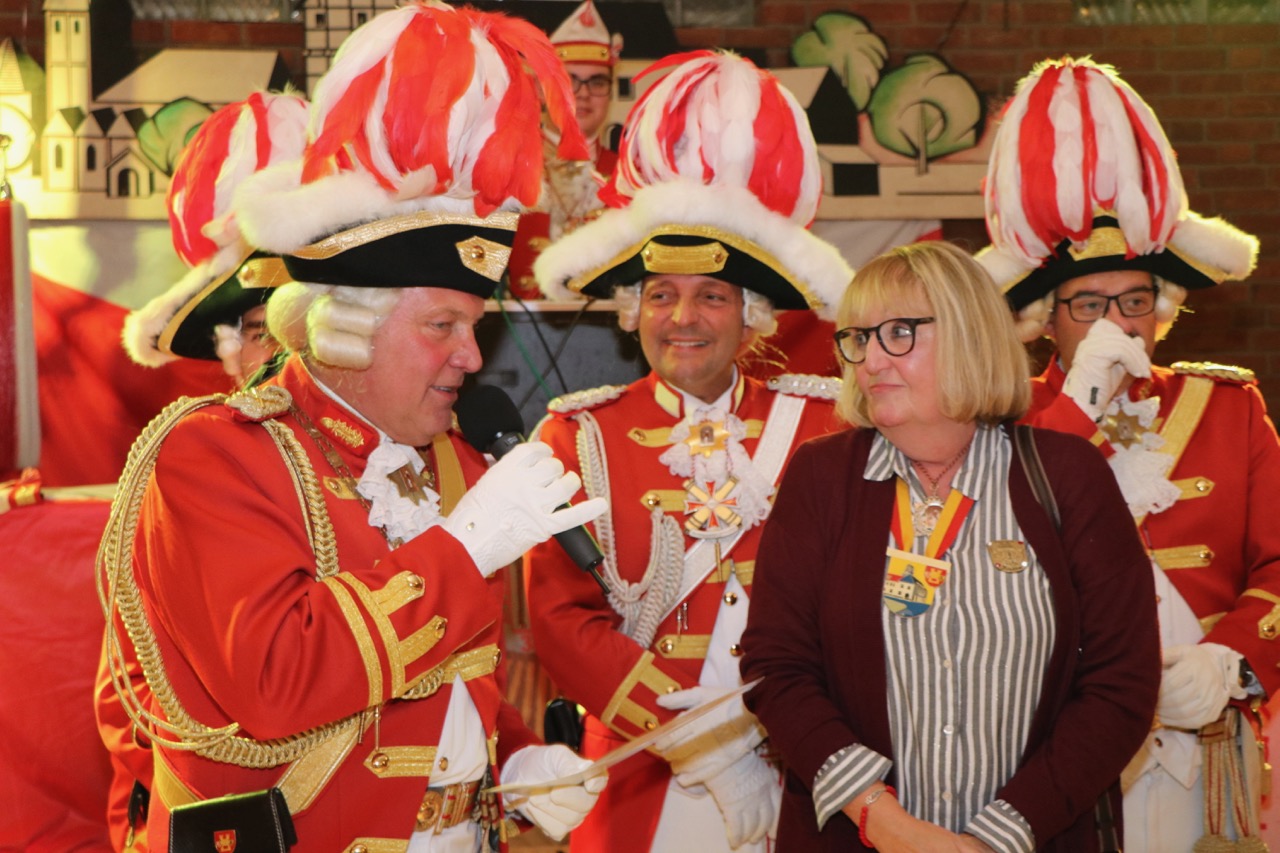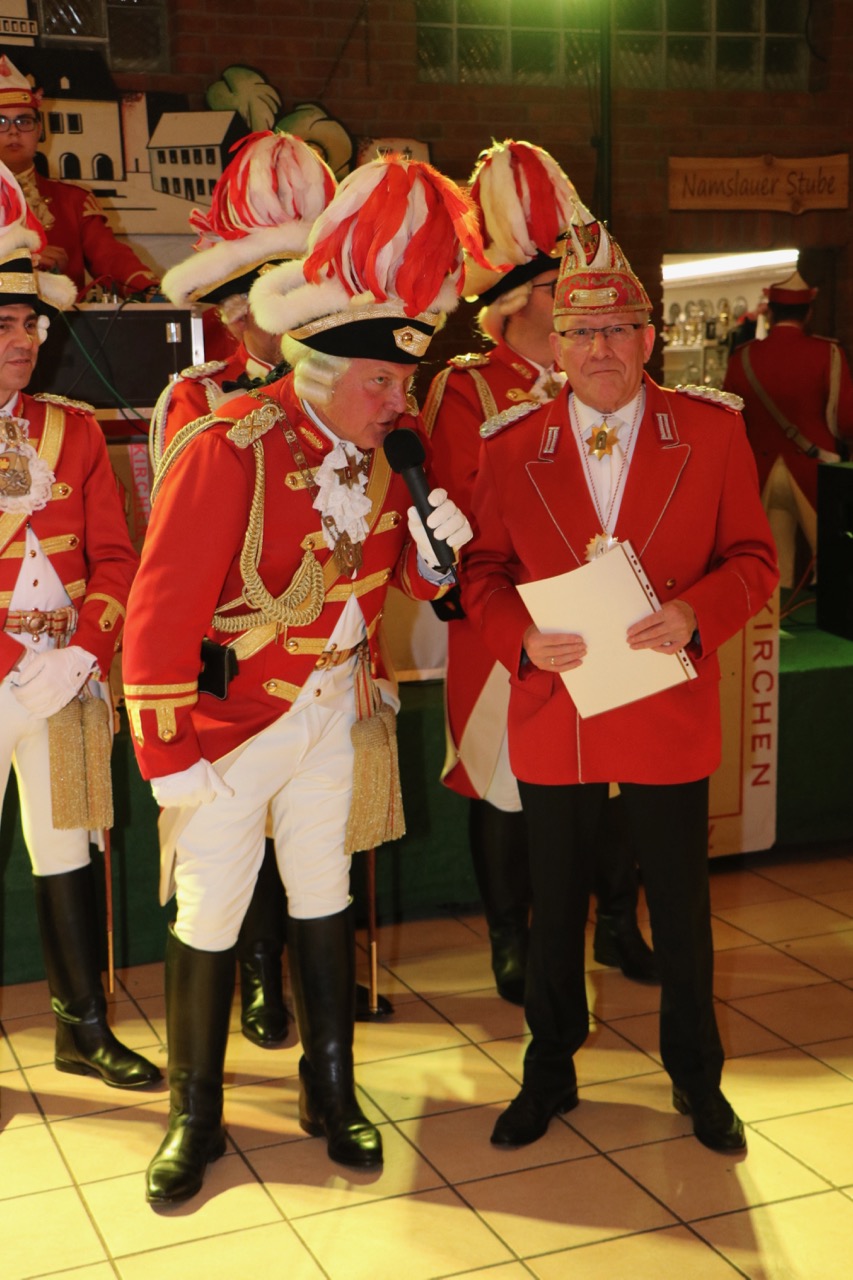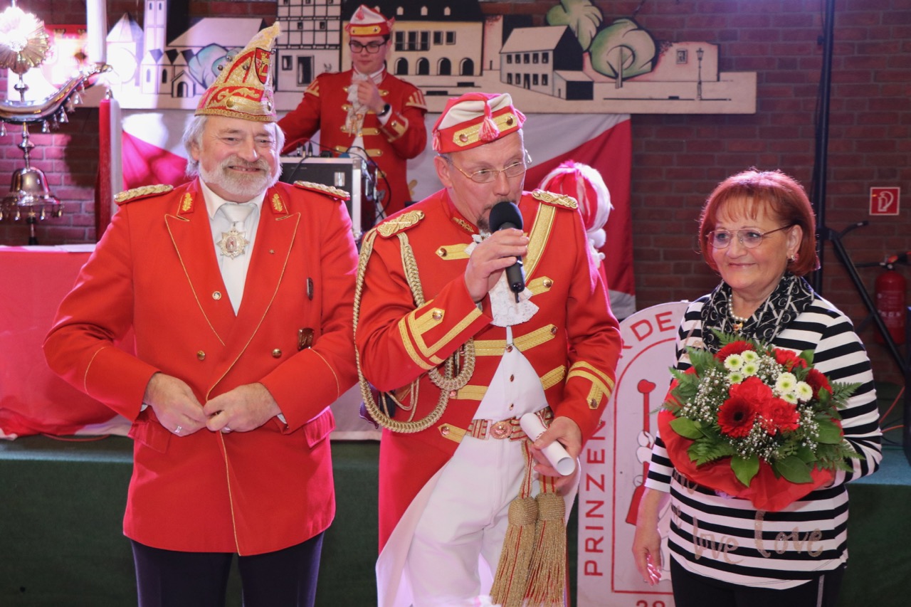 Nach dem Essen, wie immer gab es Grünkohl mit Mettwurst, wurden die ersten Ehrungen des Abends vorgenommen. Für 25 aktive Jahre wurde Joachim Rigling der entsprechende Gardestern nebst Urkunde überreicht. Das Gleiche galt für Heinz Otto Koch, Eva Maria Kerzmann und Peter Flecken für 40 aktive Jahre. Jürgen Meyer, aus dem Knubbel, wurde der besondere Gardestern für 50 aktive Jahre überreicht.