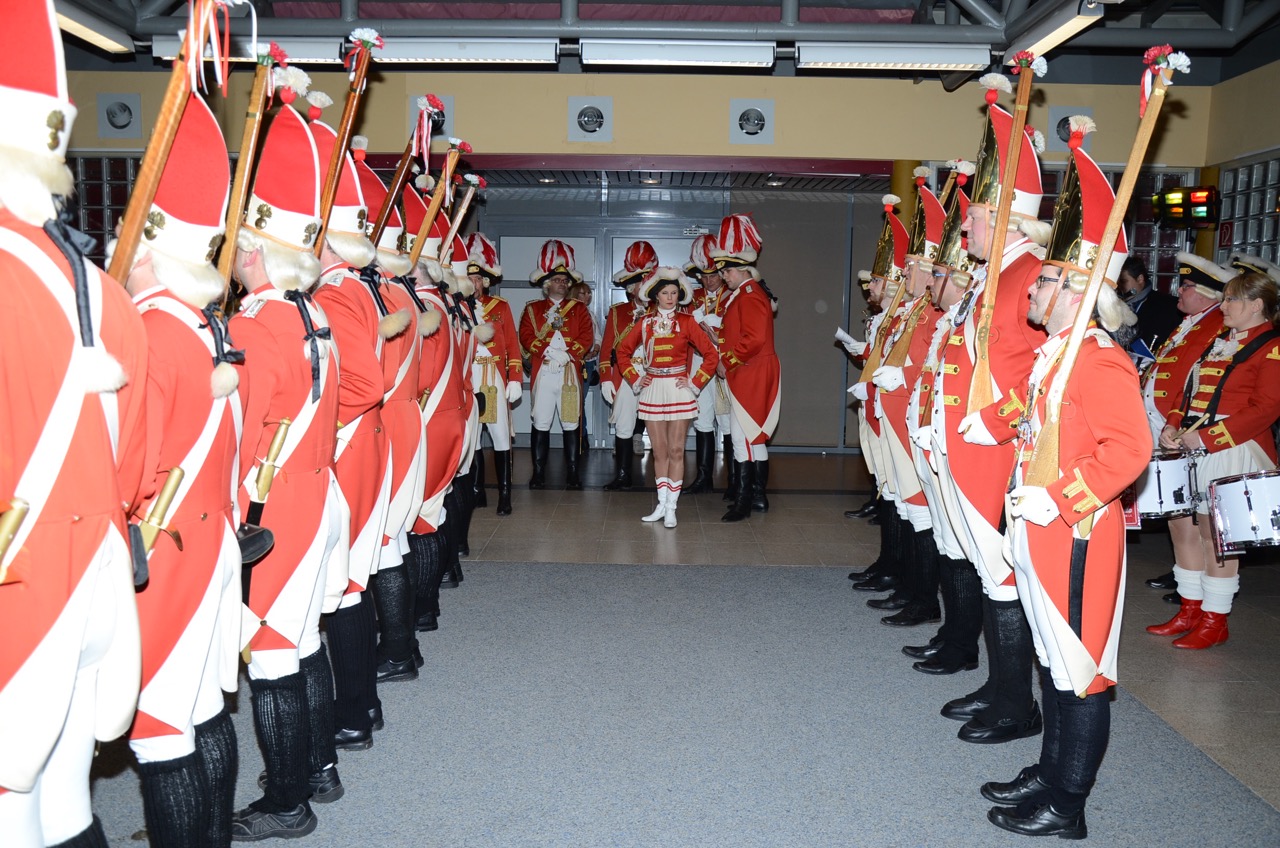 Ein letztes Mal präsentierten sich die Formationen der Prinzengarde Euskirchen vor den Tollitäten und deren Angehörigen sowie den Vorständen der heimatstädtischen Gesellschaften. Die Gardisten des Tanzcorps marschierten routiniert den Fehrbelliner Reitermarsch, Otto und der Musikzug spielten ihre Hits der Session und das Tanzpaar, Ira und Chris, wirbelten ihren letzten Tanz vor dem Publikum.