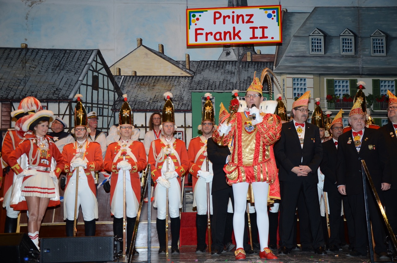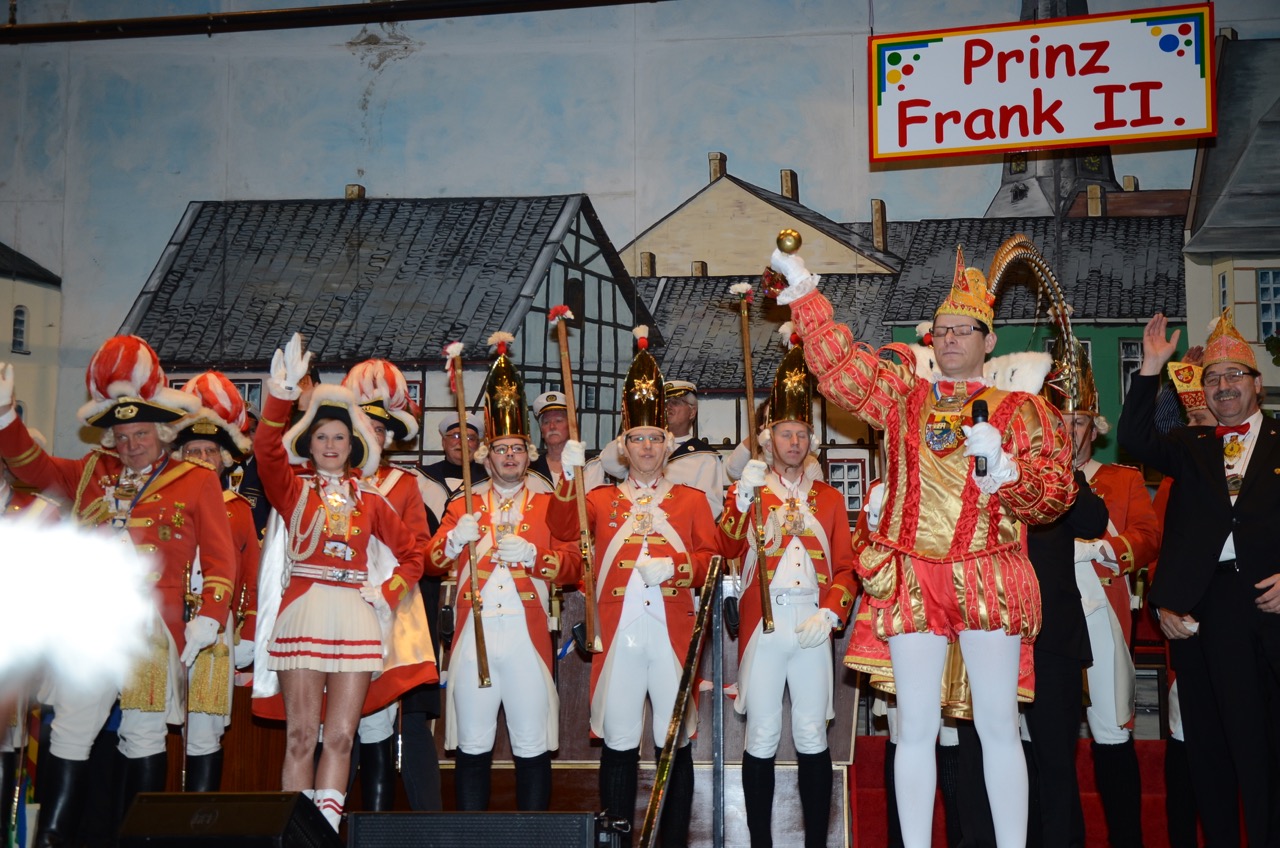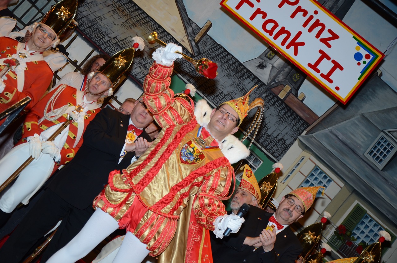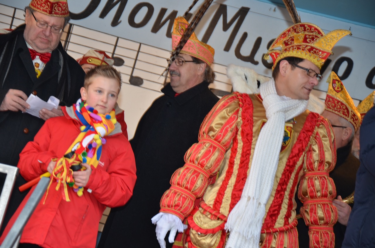 Weiter ging es zum ersten Höhepunkt des Tages, der Schlüsselübergabe auf dem Alter Markt, wo sich die heimatstädtischen Vereine und Interessensgemeinschaften trafen. Mit närrischer Macht wurde der amtierende Bürgermeister Dr. Uwe Friedl in den karnevalistischen Kurzurlaub entsandt. Pünktlich um 11:11 Uhr übernahm Sr. Tollität Prinz Frank II. die Herrschaft. Dem mäßigen Wetter trotzend wurde fröhlich gefeiert.