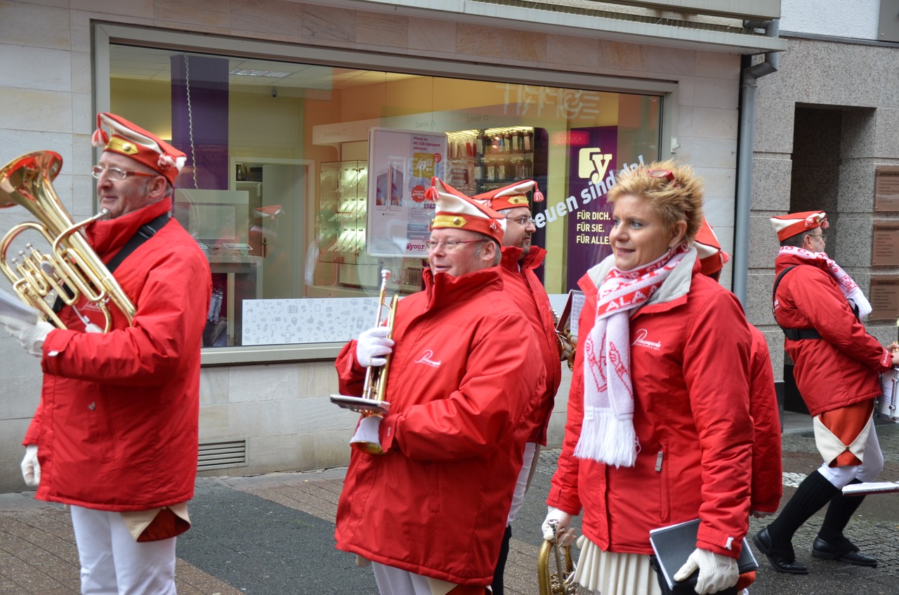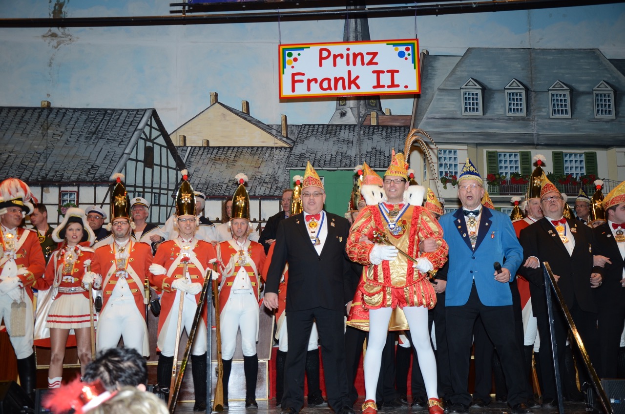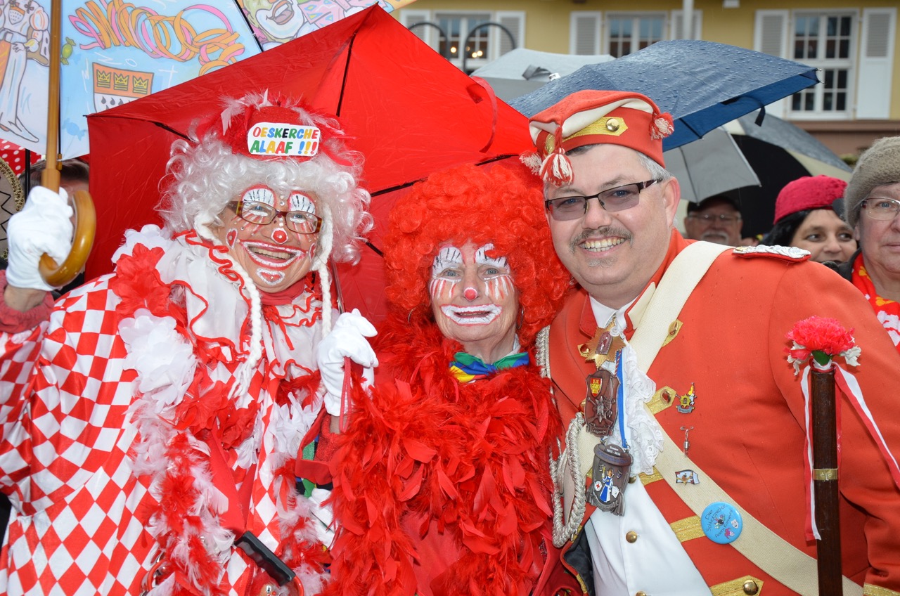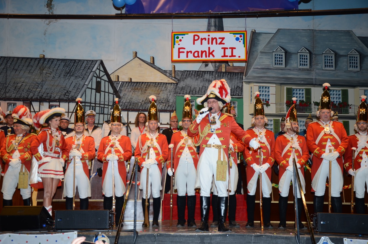 Weiter ging es zum ersten Höhepunkt des Tages, der Schlüsselübergabe auf dem Alter Markt, wo sich die heimatstädtischen Vereine und Interessensgemeinschaften trafen. Mit närrischer Macht wurde der amtierende Bürgermeister Dr. Uwe Friedl in den karnevalistischen Kurzurlaub entsandt. Pünktlich um 11:11 Uhr übernahm Sr. Tollität Prinz Frank II. die Herrschaft. Dem mäßigen Wetter trotzend wurde fröhlich gefeiert.