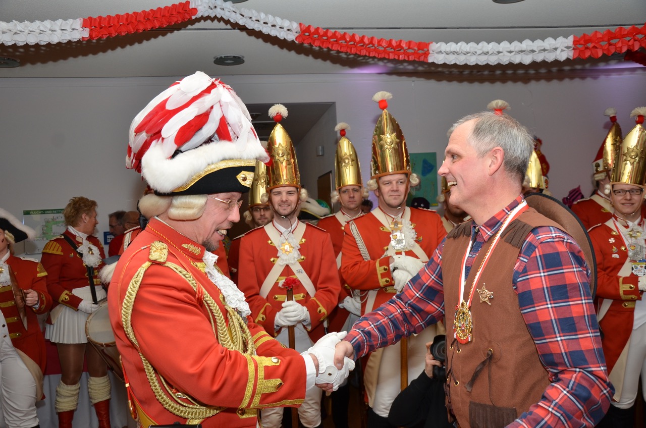 Nachdem der beurlaubte Erste Bürger der Stadt den Rückzug in seine Gemächer der Stadtverwaltung angetreten war, folgte ihm die Prinzengarde spontan und bewies, nicht zum ersten oder letzten Mal an diesem Tage, dass auch in der kleinsten Bude Platz sein kann. Inmitten der jecken Bediensteten der Stadt wurde der Regierungswechsel fröhlich weiter gefeiert und die Gardisten des Tanzcorps nahmen die Damen zum Wibbeln in Gefangenschaft.