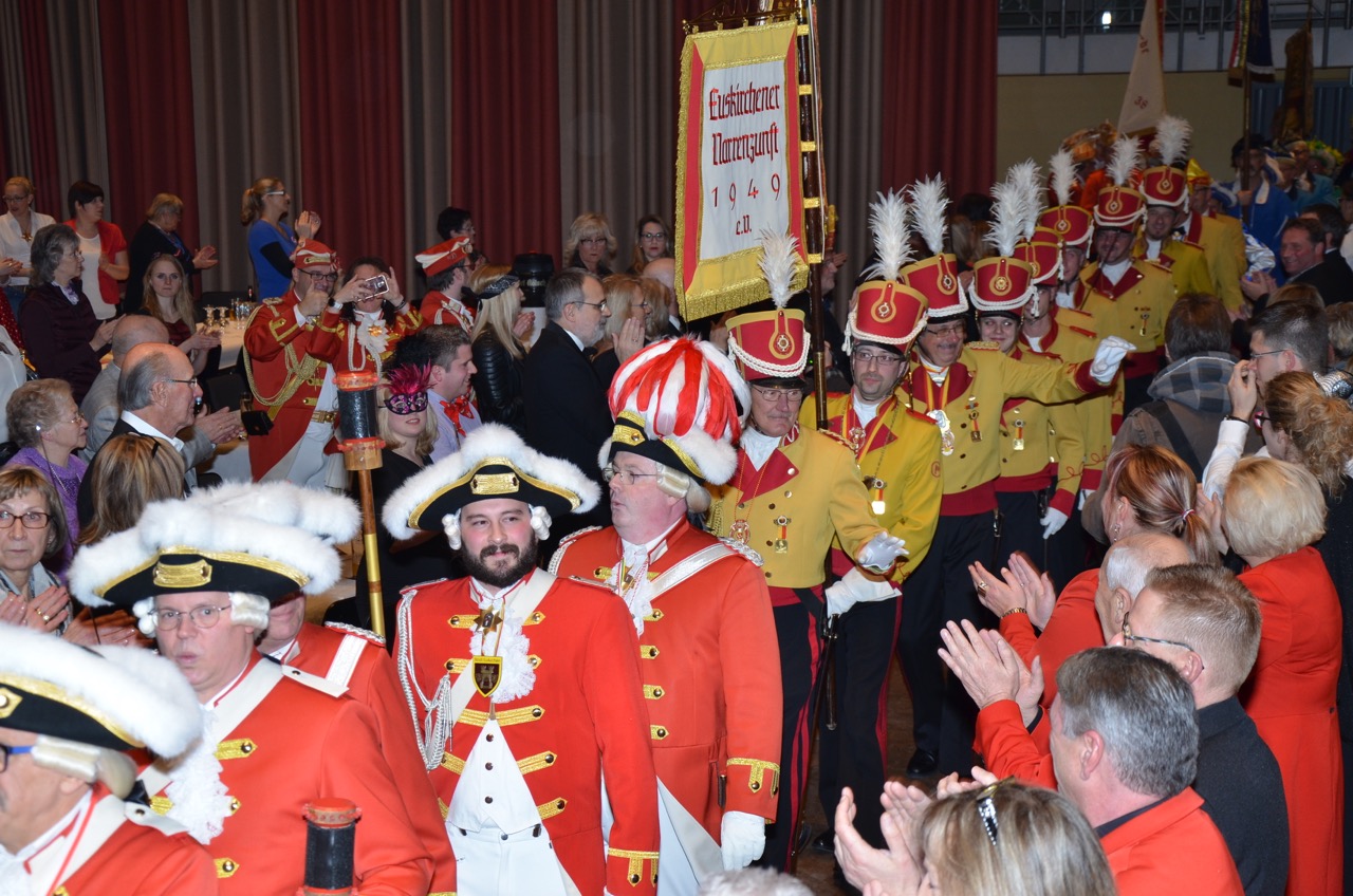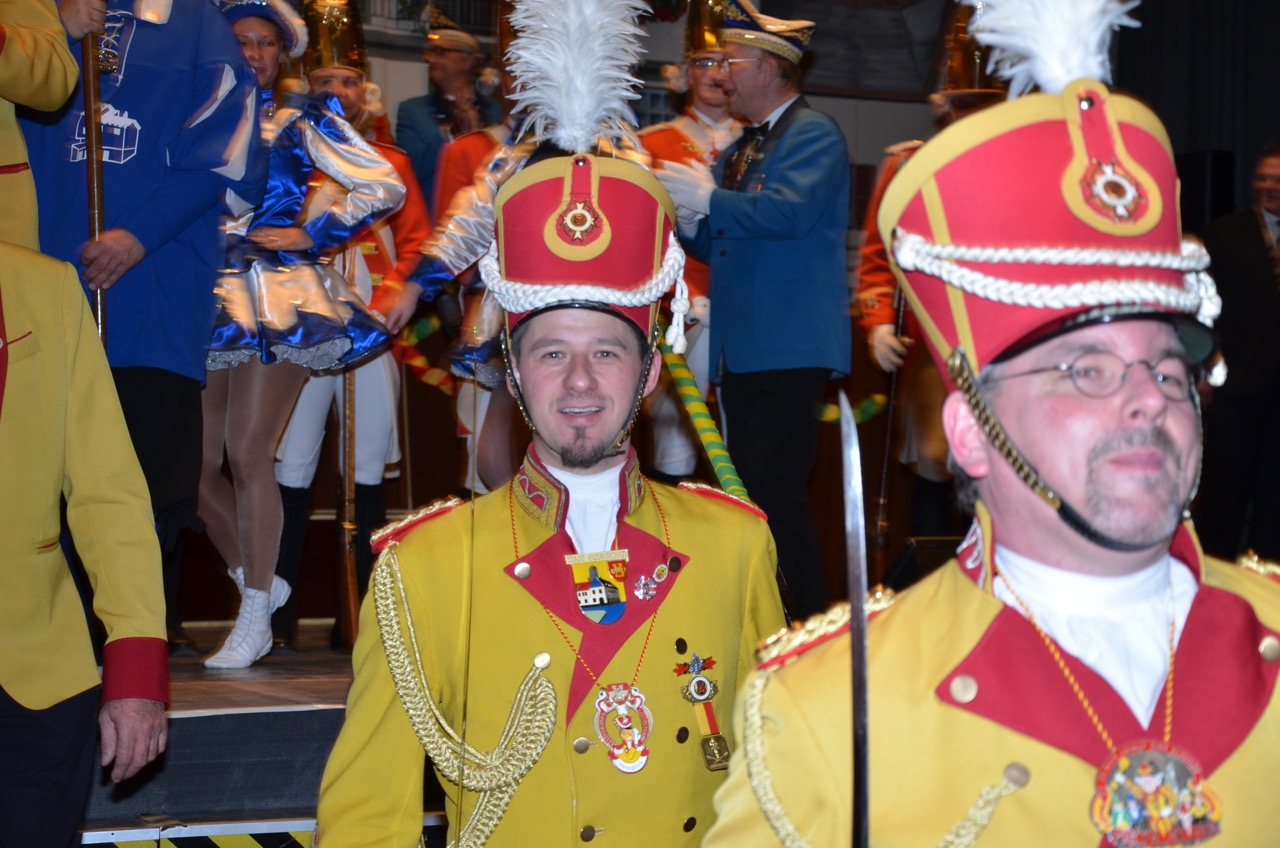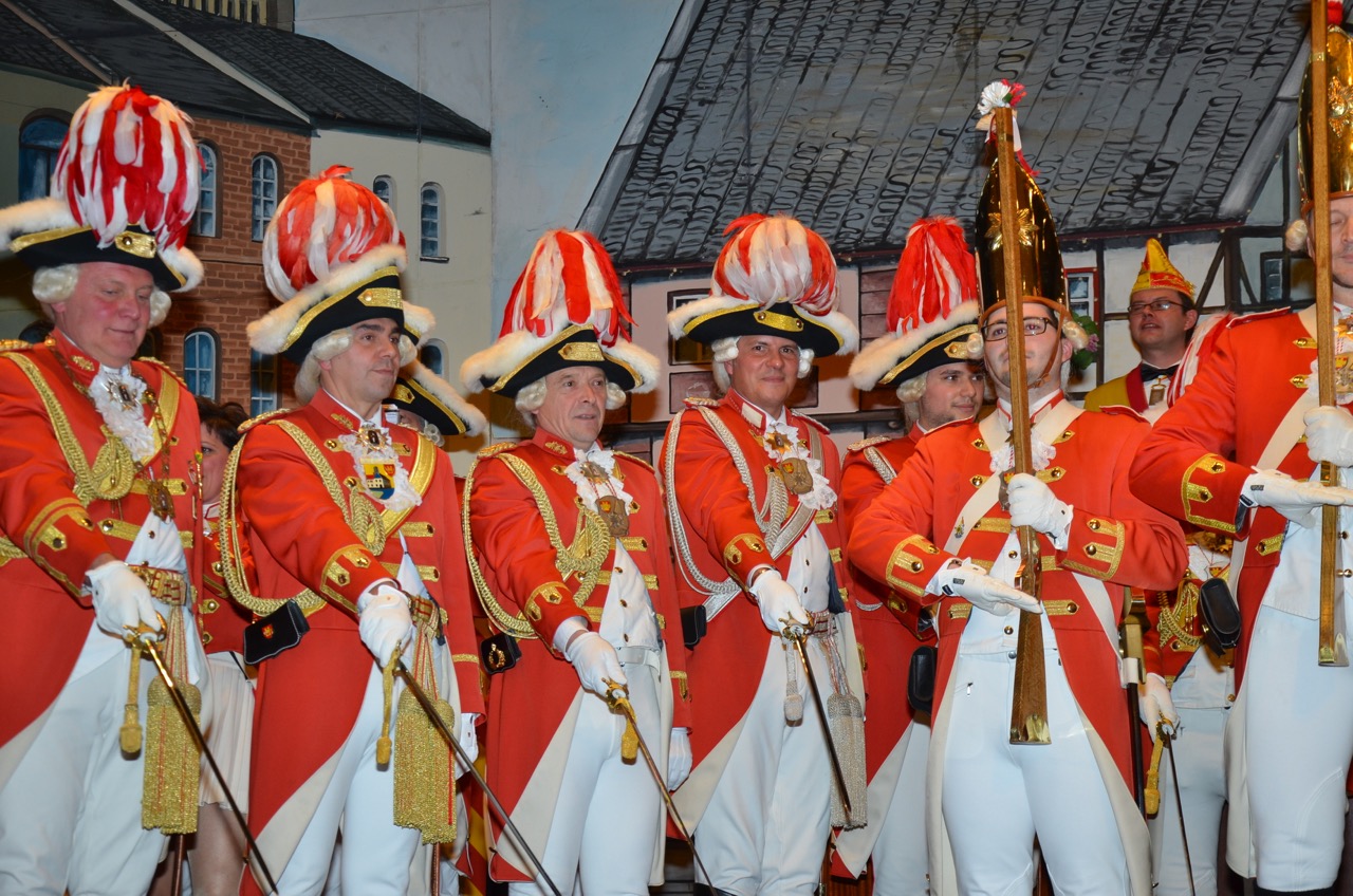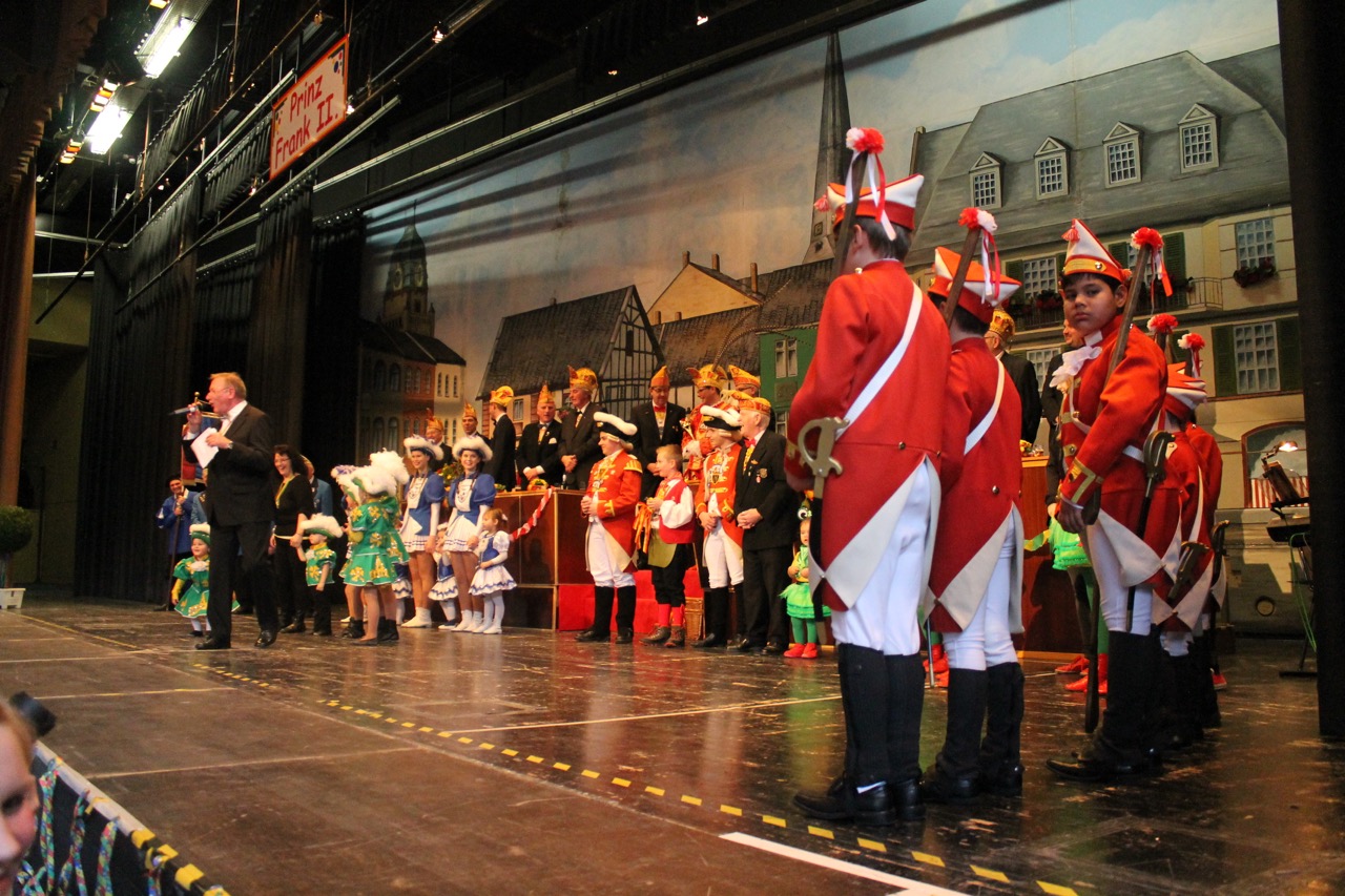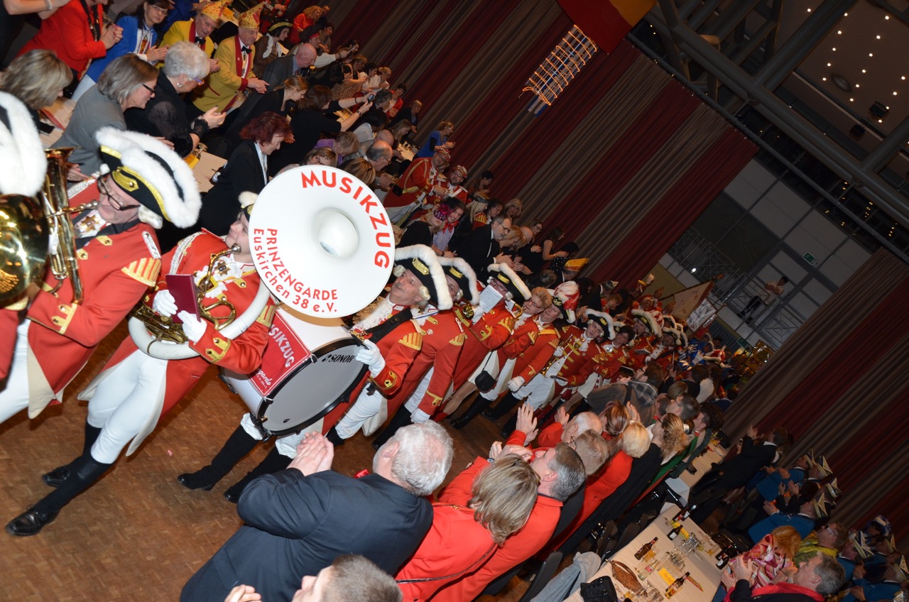 „Oeskerche Alaaf“ schallte es am 8. Januar 2016 durch das Euskirchener City-Forum. Im Rahmen der großen Sitzungsparty, organisiert von den vier heimatstädtischen Vereinen, begleitete die Prinzengarde Euskirchen 1938 e.V. mit fast 100 aktiven Gardisten den diesjährigen Kernstadtprinzen Frank II. zur Bühne. Im Anschluß an die Proklamation durch unseren Bürgermeister Dr. Uwe Friedl übernahm das Tanzcorps zum ersten Tanz die Bühne. Leider war unsere Regimentstochter Ira erkrankt und somit mußten wir auf den Mariechentanz verzichten. Aus der Not heraus wurde der „doppelte Fehrbelliner“ geboren, das heißt, zwei mal acht Gardisten tanzten den traditionellen Gardetanz der Prinzengarde. Den Auftritt beendete unser Musikzug mit einem kölschen Medly.