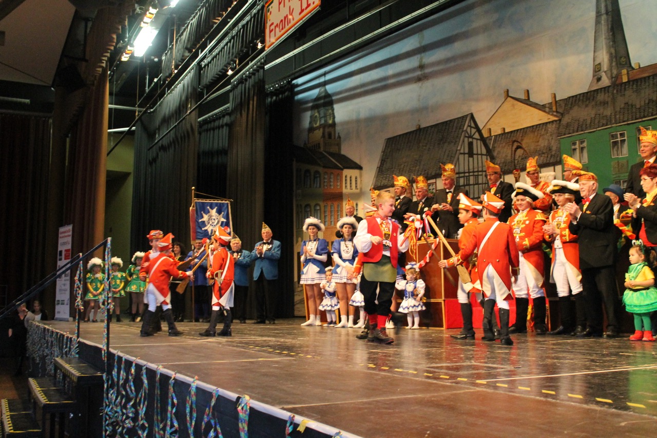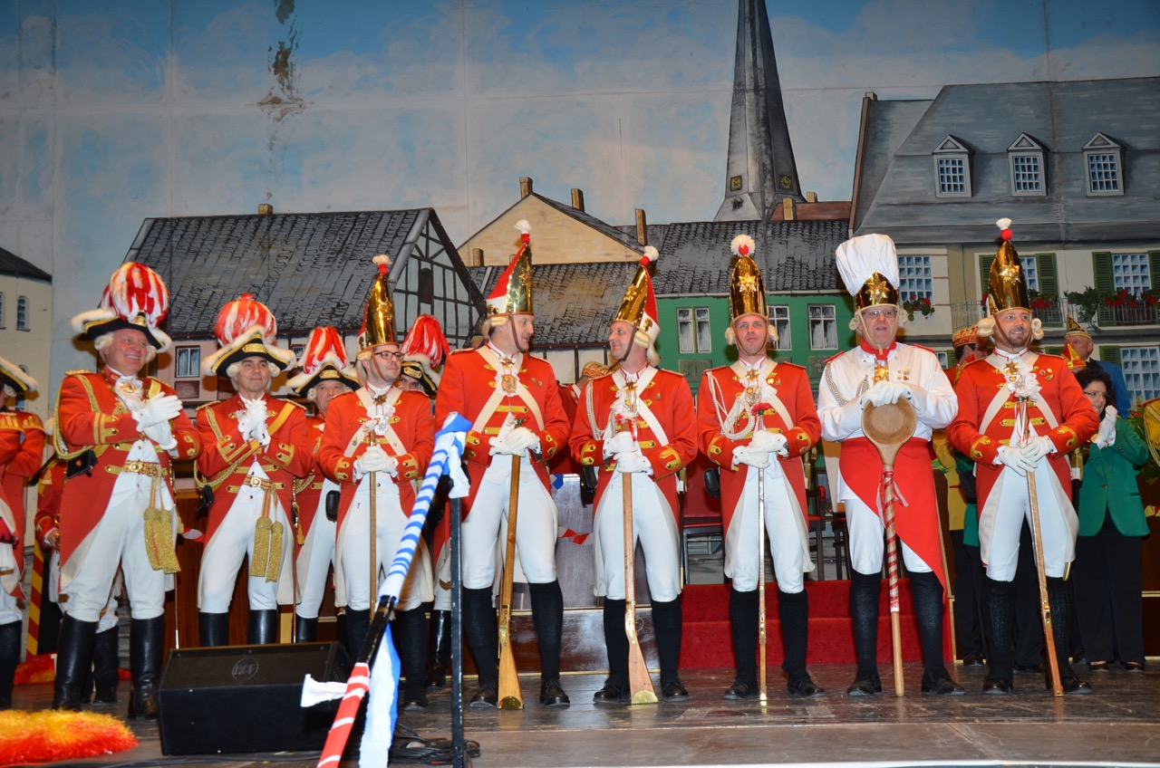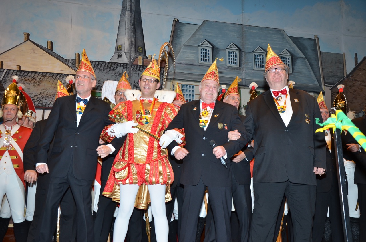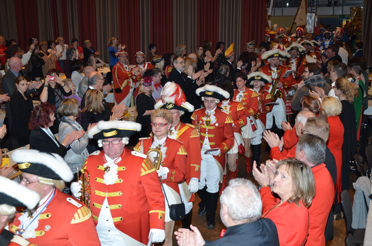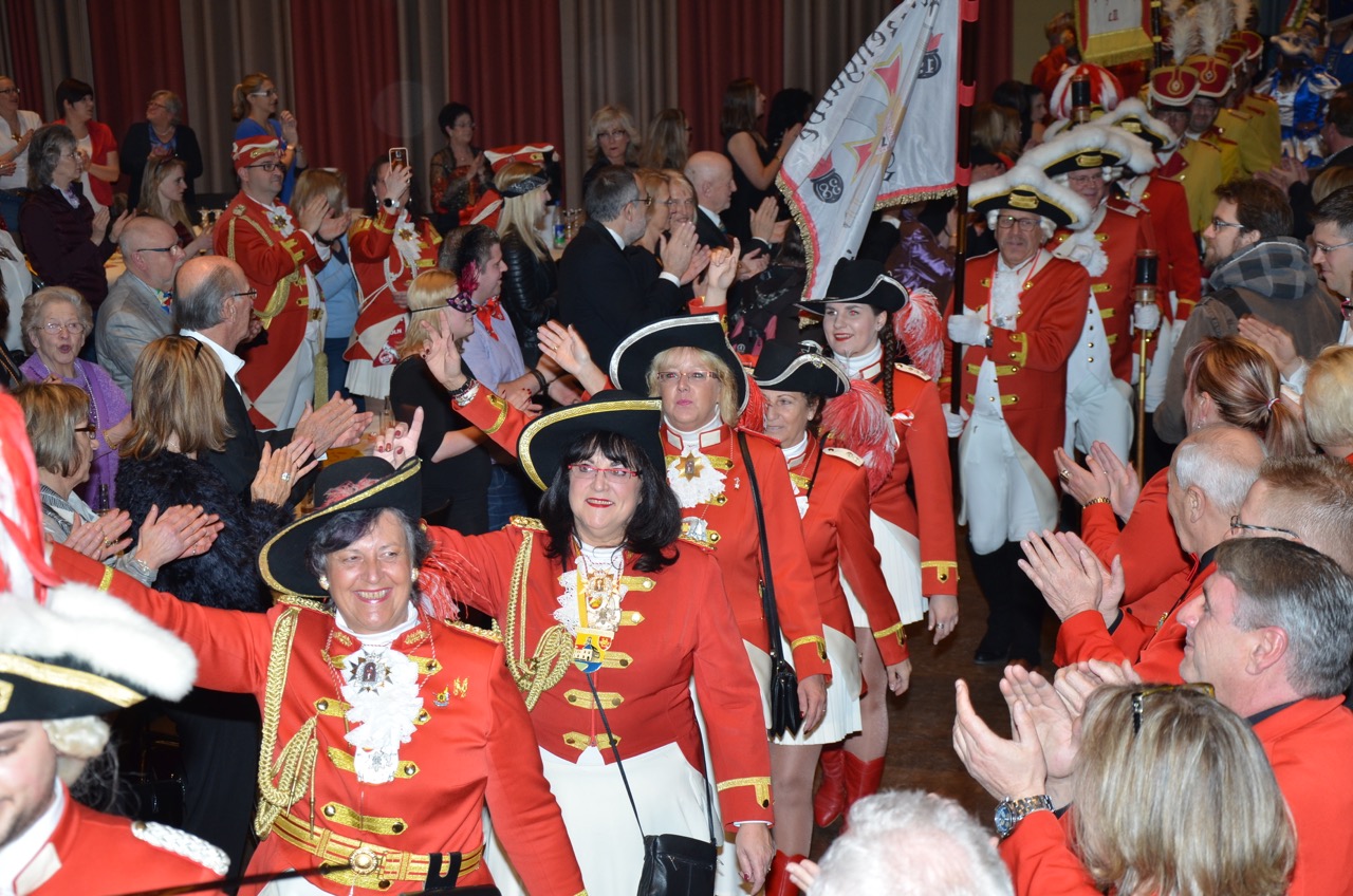 „Oeskerche Alaaf“ schallte es am 8. Januar 2016 durch das Euskirchener City-Forum. Im Rahmen der großen Sitzungsparty, organisiert von den vier heimatstädtischen Vereinen, begleitete die Prinzengarde Euskirchen 1938 e.V. mit fast 100 aktiven Gardisten den diesjährigen Kernstadtprinzen Frank II. zur Bühne. Im Anschluß an die Proklamation durch unseren Bürgermeister Dr. Uwe Friedl übernahm das Tanzcorps zum ersten Tanz die Bühne. Leider war unsere Regimentstochter Ira erkrankt und somit mußten wir auf den Mariechentanz verzichten. Aus der Not heraus wurde der „doppelte Fehrbelliner“ geboren, das heißt, zwei mal acht Gardisten tanzten den traditionellen Gardetanz der Prinzengarde. Den Auftritt beendete unser Musikzug mit einem kölschen Medly.