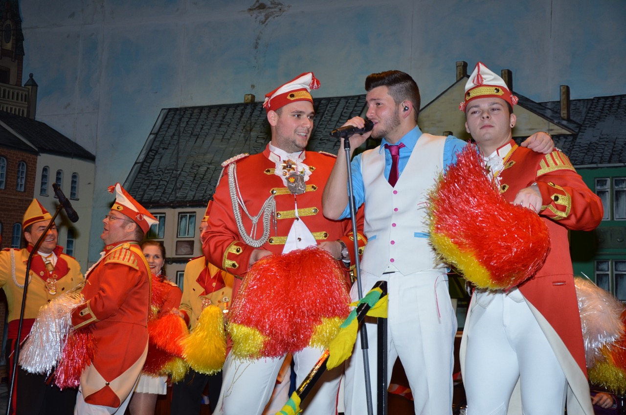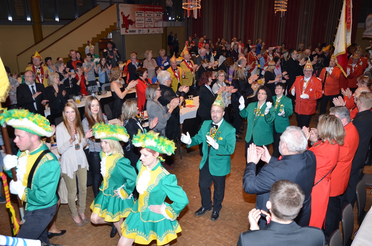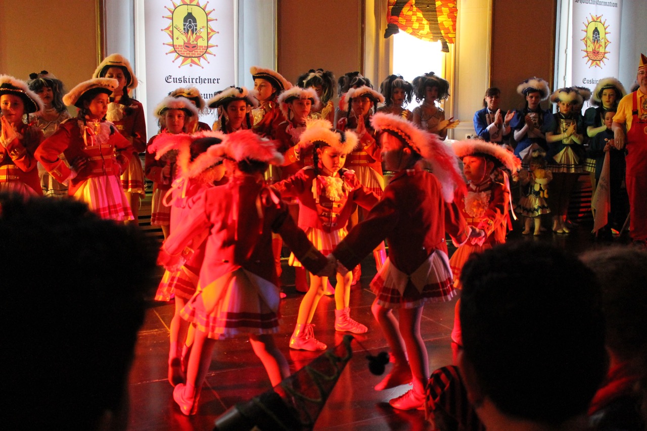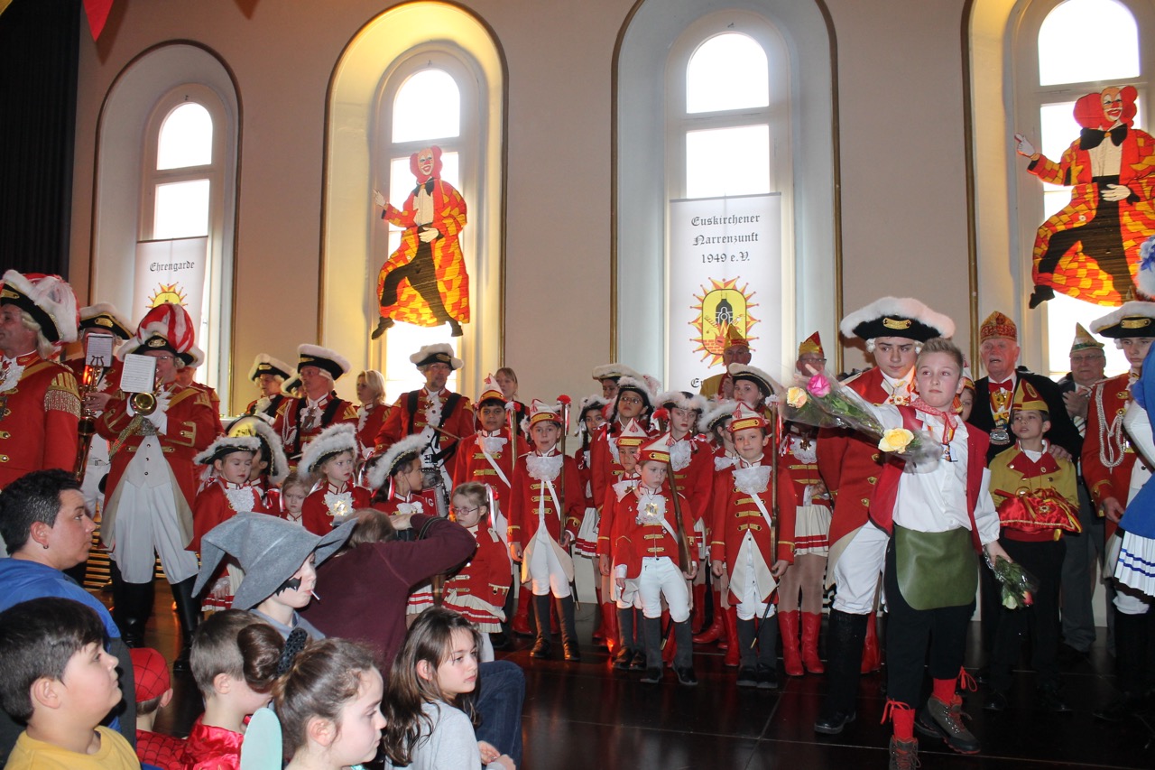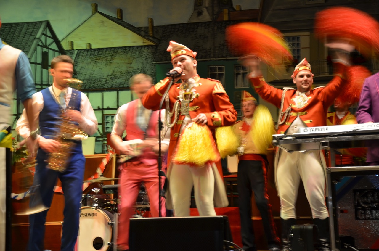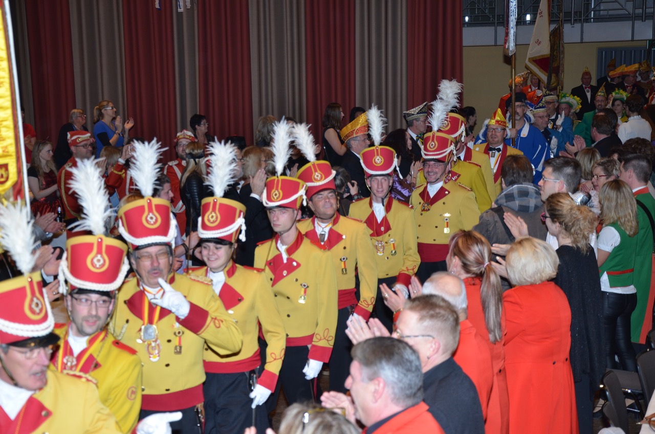 „Oeskerche Alaaf“ schallte es am 8. Januar 2016 durch das Euskirchener City-Forum. Im Rahmen der großen Sitzungsparty, organisiert von den vier heimatstädtischen Vereinen, begleitete die Prinzengarde Euskirchen 1938 e.V. mit fast 100 aktiven Gardisten den diesjährigen Kernstadtprinzen Frank II. zur Bühne. Im Anschluß an die Proklamation durch unseren Bürgermeister Dr. Uwe Friedl übernahm das Tanzcorps zum ersten Tanz die Bühne. Leider war unsere Regimentstochter Ira erkrankt und somit mußten wir auf den Mariechentanz verzichten. Aus der Not heraus wurde der „doppelte Fehrbelliner“ geboren, das heißt, zwei mal acht Gardisten tanzten den traditionellen Gardetanz der Prinzengarde. Den Auftritt beendete unser Musikzug mit einem kölschen Medly.