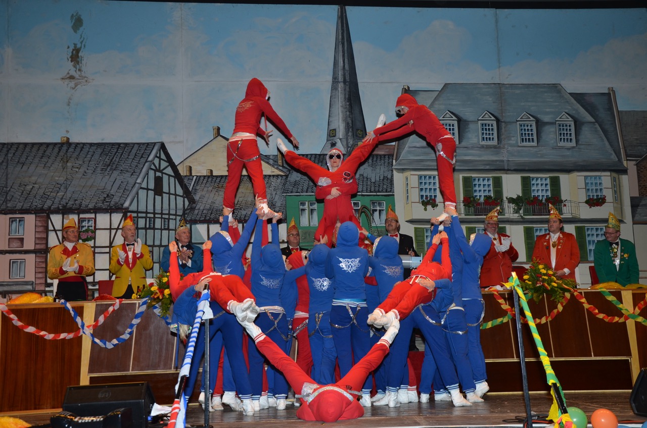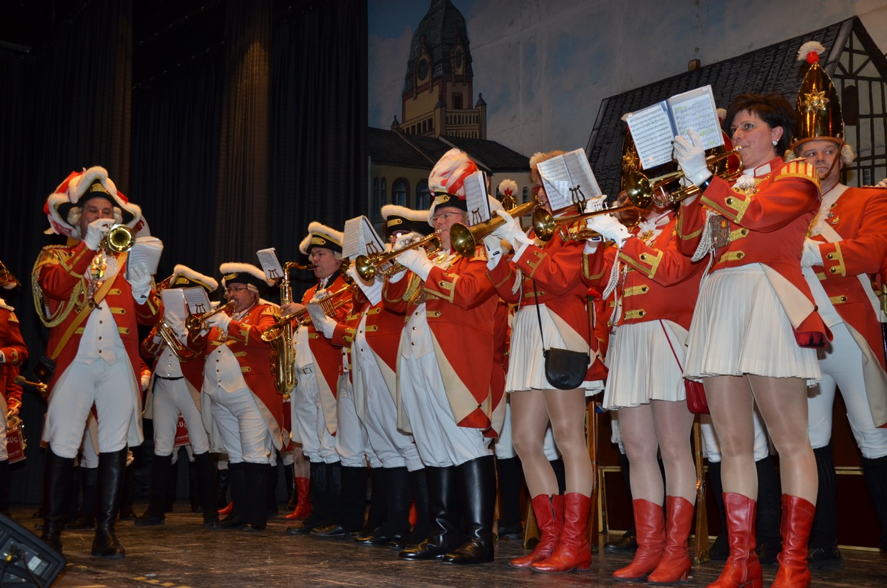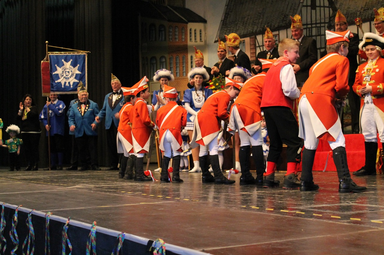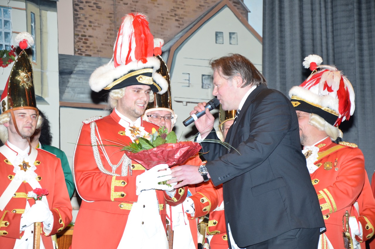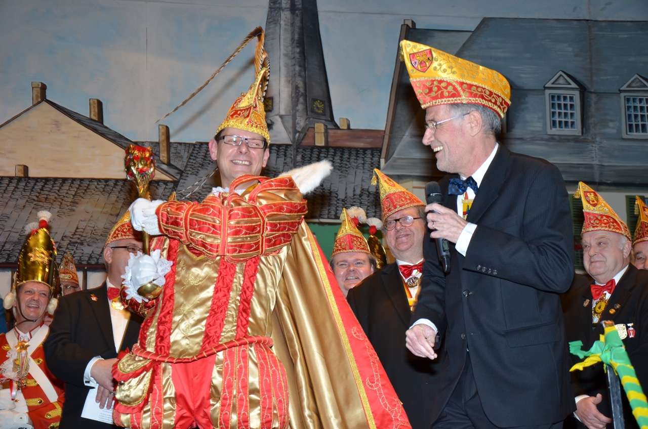 „Oeskerche Alaaf“ schallte es am 8. Januar 2016 durch das Euskirchener City-Forum. Im Rahmen der großen Sitzungsparty, organisiert von den vier heimatstädtischen Vereinen, begleitete die Prinzengarde Euskirchen 1938 e.V. mit fast 100 aktiven Gardisten den diesjährigen Kernstadtprinzen Frank II. zur Bühne. Im Anschluß an die Proklamation durch unseren Bürgermeister Dr. Uwe Friedl übernahm das Tanzcorps zum ersten Tanz die Bühne. Leider war unsere Regimentstochter Ira erkrankt und somit mußten wir auf den Mariechentanz verzichten. Aus der Not heraus wurde der „doppelte Fehrbelliner“ geboren, das heißt, zwei mal acht Gardisten tanzten den traditionellen Gardetanz der Prinzengarde. Den Auftritt beendete unser Musikzug mit einem kölschen Medly.