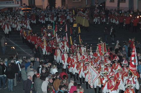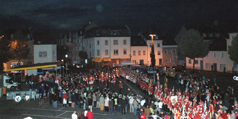 Ein herrliches Bild bot sich Präsident und Kommandant, die die Gesellschaften von der aus Bühne begrüßten. Gegen 19:20 Uhr marschierte eine 143 Mann starke Ehrenformation auf den Annaturmplatz zu Euskirchen und präsentierte den Euskirchener Bürgern einen würdevollen und rundum gelungenen Jubiläumszapfenstreich zum 75-jährigen Bestehen der Prinzengarde Euskirchen 1938 e.V..