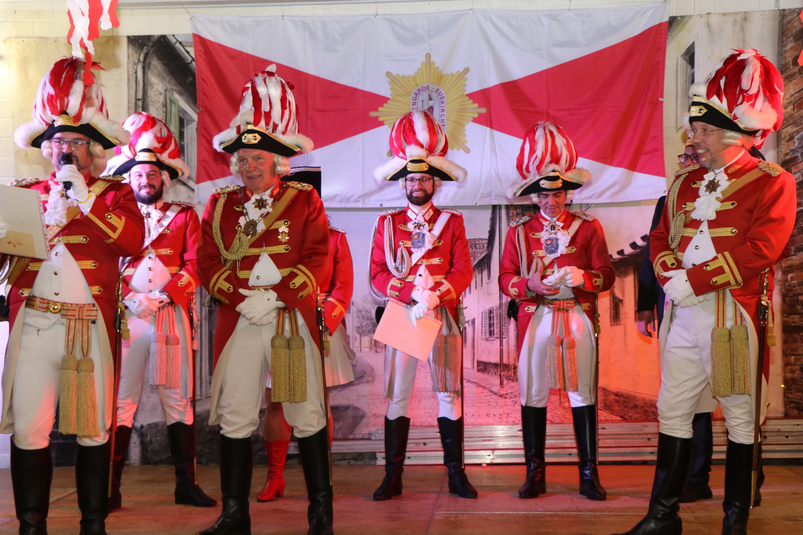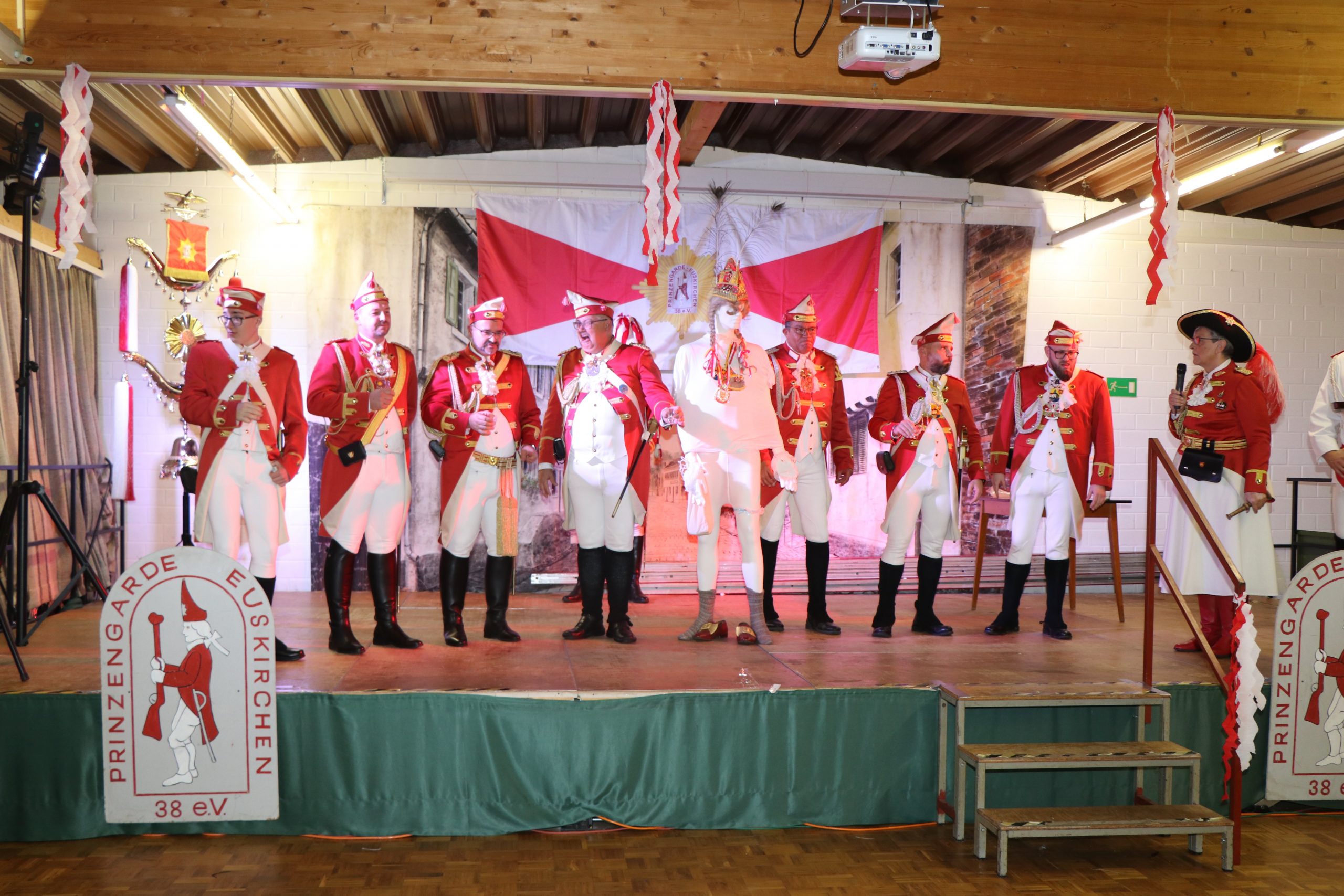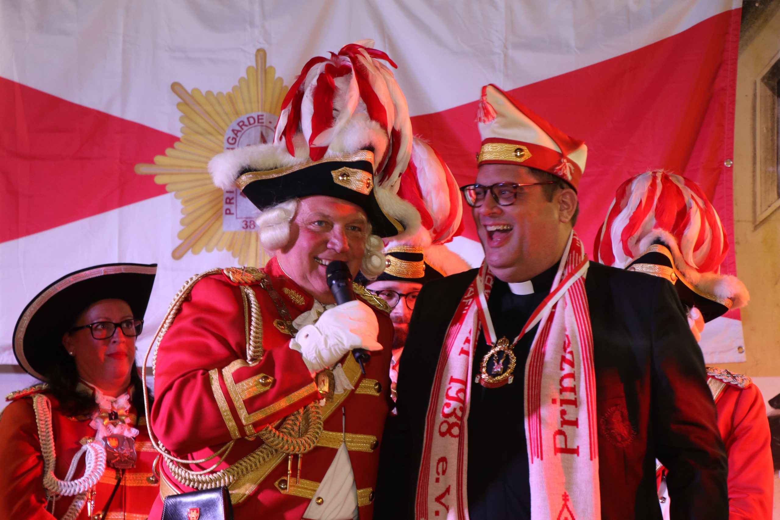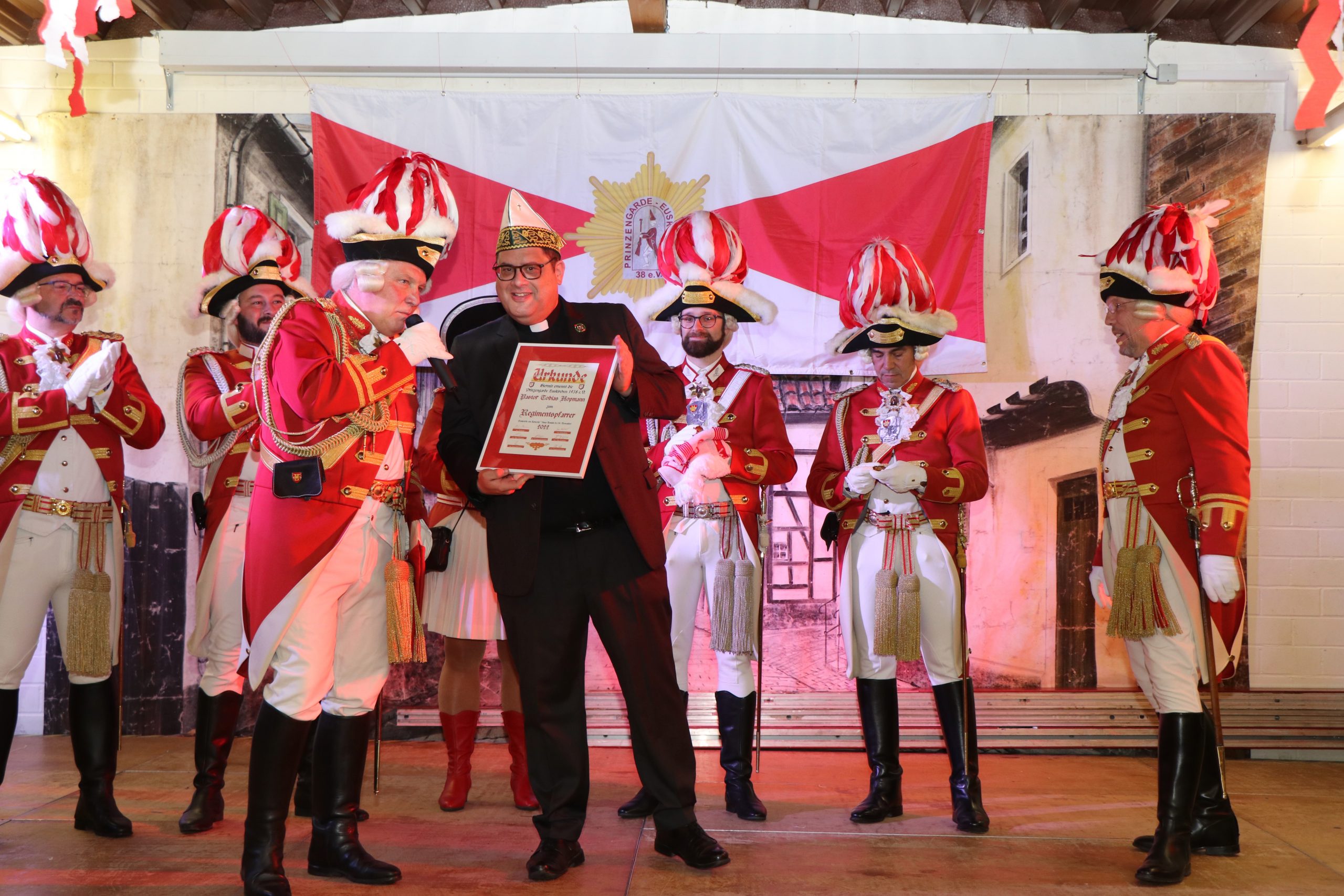 Ehrungen und Ernennungen gab es natürlich auch. So wurde unserem Präsidenten für 50 aktive Jahre der besondere Gardestern nebst Urkunde übereicht. Ferner durfte die Prinzengarde Pastor Tobias Hopmann zum neuen Regimentspfarrer ernennen. Unser Präsident überreichte Ihm neben der Ernennungsurkunde noch die Feldmütze und den Schal der Prinzengarde.