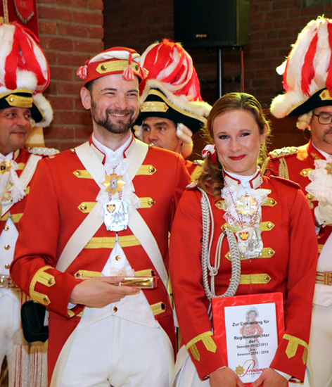 Als Geschenk überreichte die Prinzengarde Erik eine Armbanduhr mit Gravur und Gardesternemblem und Ira bekam einen über 120 Seiten starken Bildband über ihre aktive Zeit als Regimentstochter.