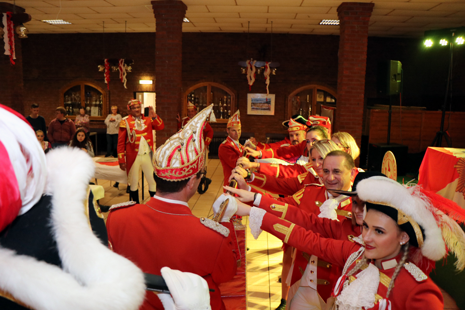 Neben den Tollitäten aus dem Stadtgebiet durfte sich auch die Prinzengarde über eine Einladung freuen, was für uns natürlich hieß: ‚Großes Gefolge‘ und das heißt auch Tanzen und Stippeföttche. Und wenn man schon so viele Tollitäten an einem Ort hat, warum lassen wir die Tollitäten nicht mal den berühmten Stippeföttchetanz der Prinzengarde tanzen. Gesagt, getan, in einer Reihe die Tollitäten aufgestellt, affjezellt un los ging es.