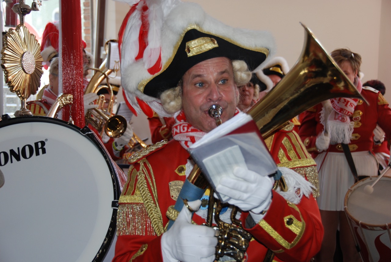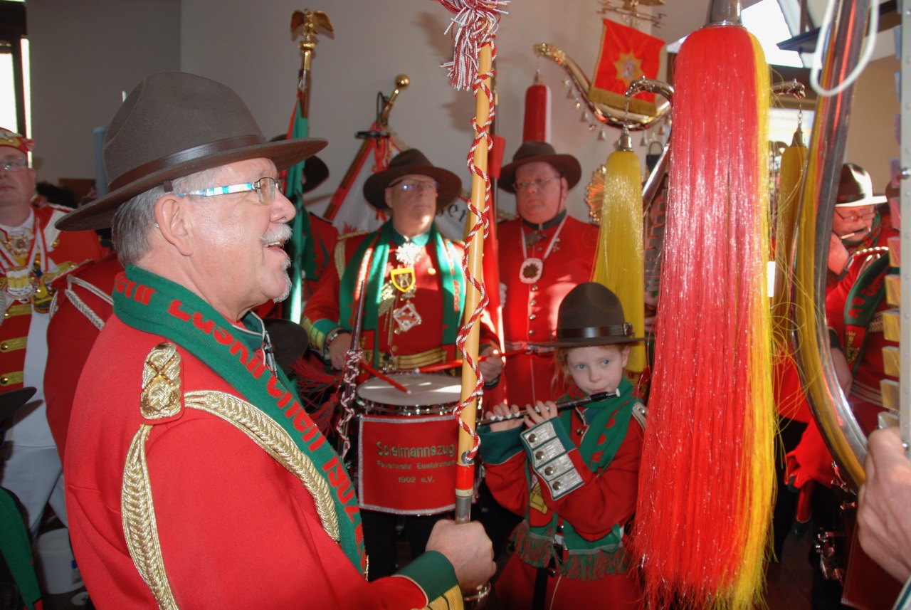 Formationsführer Aloisius ruft eine halbe Stunde vor dem Auftritt: “Austrinken und Abmarsch, de Bus wartet, um uns die Bahnhofstrasse zum Parkhotel rauf zu bringen“. Die Menge mosert und dann kütt doch noch eine Runde Bier.