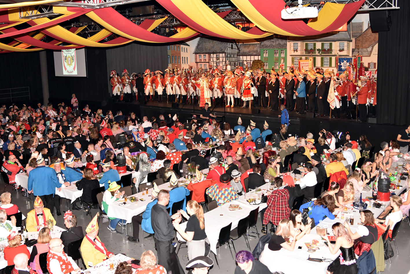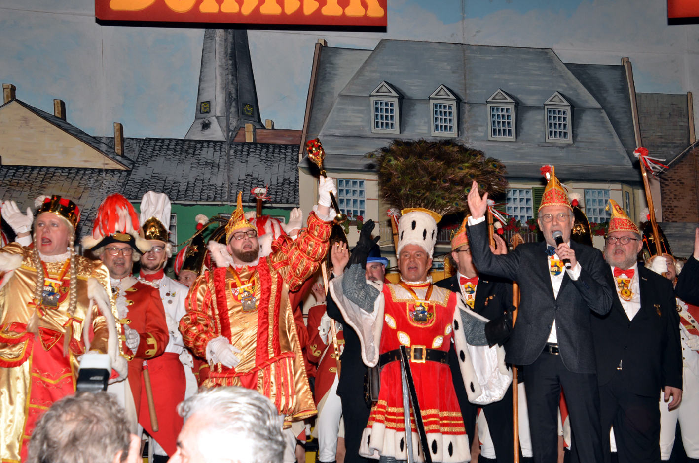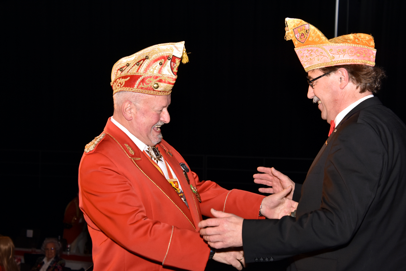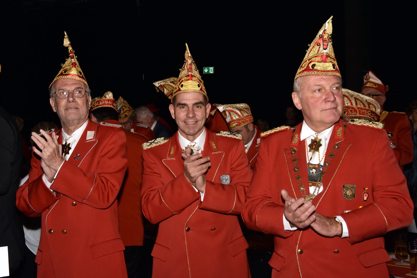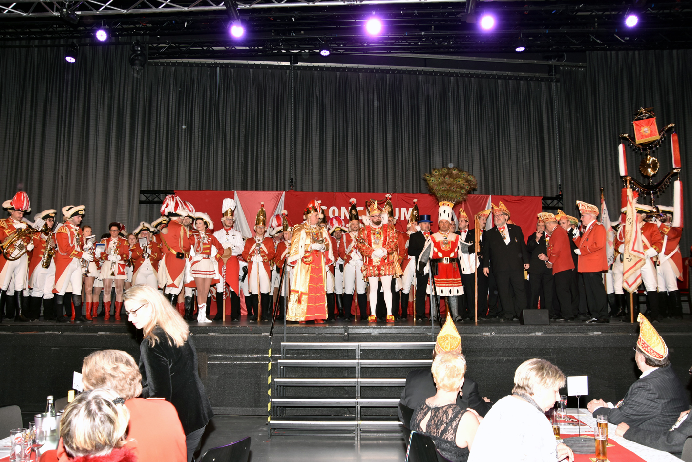 Und … tosender Empfang im Parkhotel. Prinz, Bauer und Jungfrau waren plötzlich im Saal verschwunden. Die Fahne der Reserve nahm die ganze Bühne alleine ein. Standing Ovations. Das Publikum peitschte die Reserve an. Der minutenlange Auftritt der Fahne wurde, nachdem das Dreigestirn mit dem Motto durch war, wieder in den Vordergrund gerückt. Das Publikum trommelte als die Fahne den diesjährigen Orden verliehen bekam.