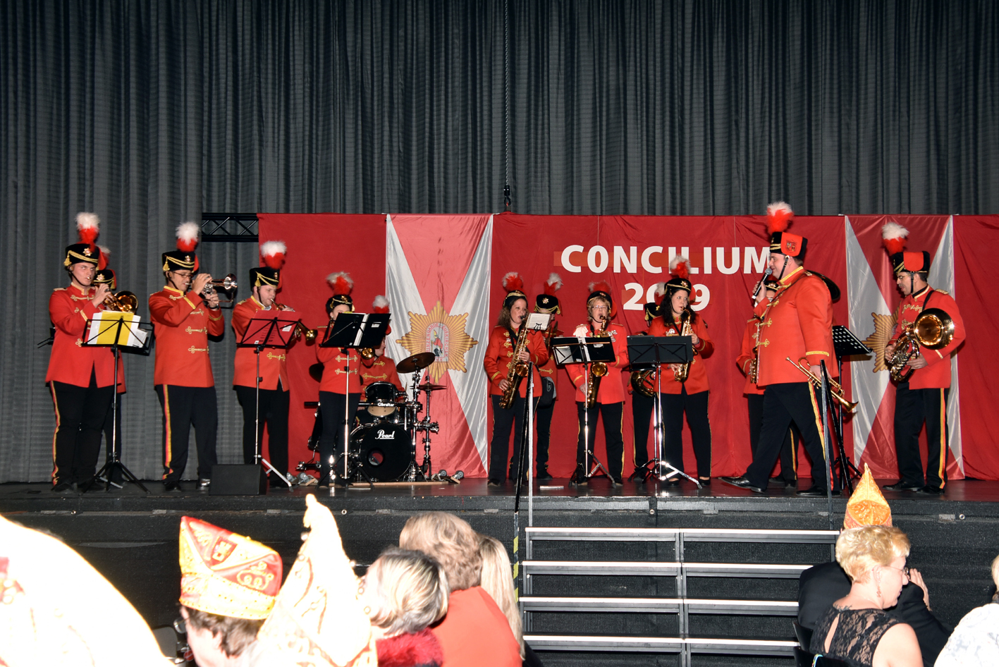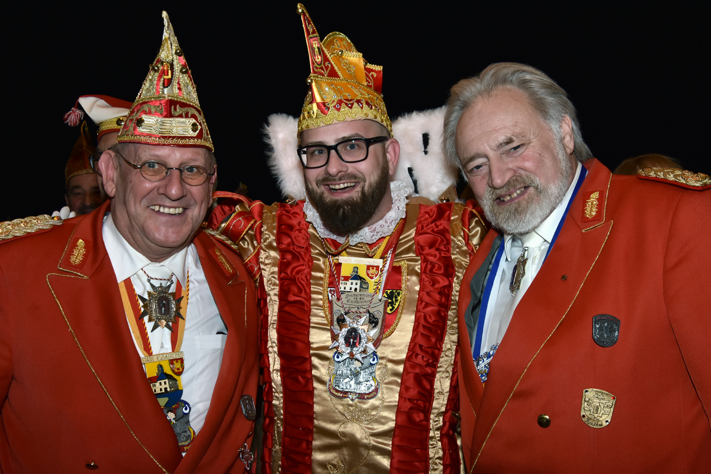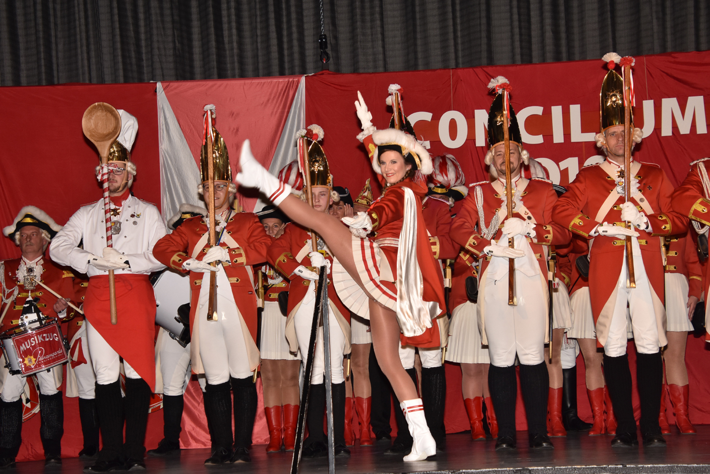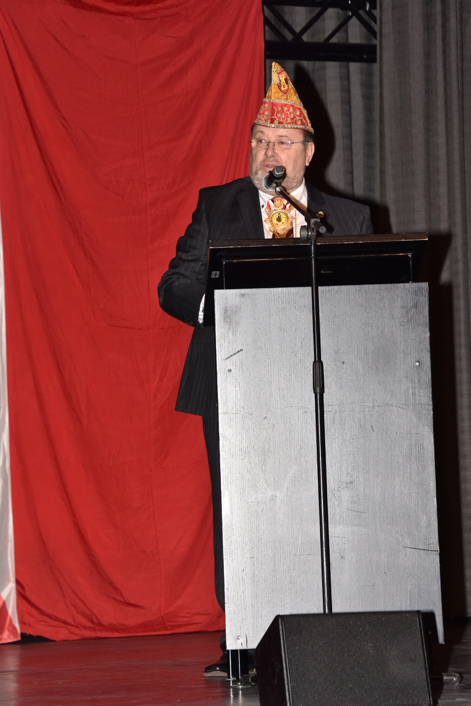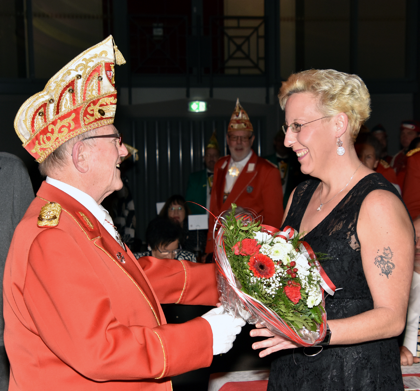 Und … tosender Empfang im Parkhotel. Prinz, Bauer und Jungfrau waren plötzlich im Saal verschwunden. Die Fahne der Reserve nahm die ganze Bühne alleine ein. Standing Ovations. Das Publikum peitschte die Reserve an. Der minutenlange Auftritt der Fahne wurde, nachdem das Dreigestirn mit dem Motto durch war, wieder in den Vordergrund gerückt. Das Publikum trommelte als die Fahne den diesjährigen Orden verliehen bekam.