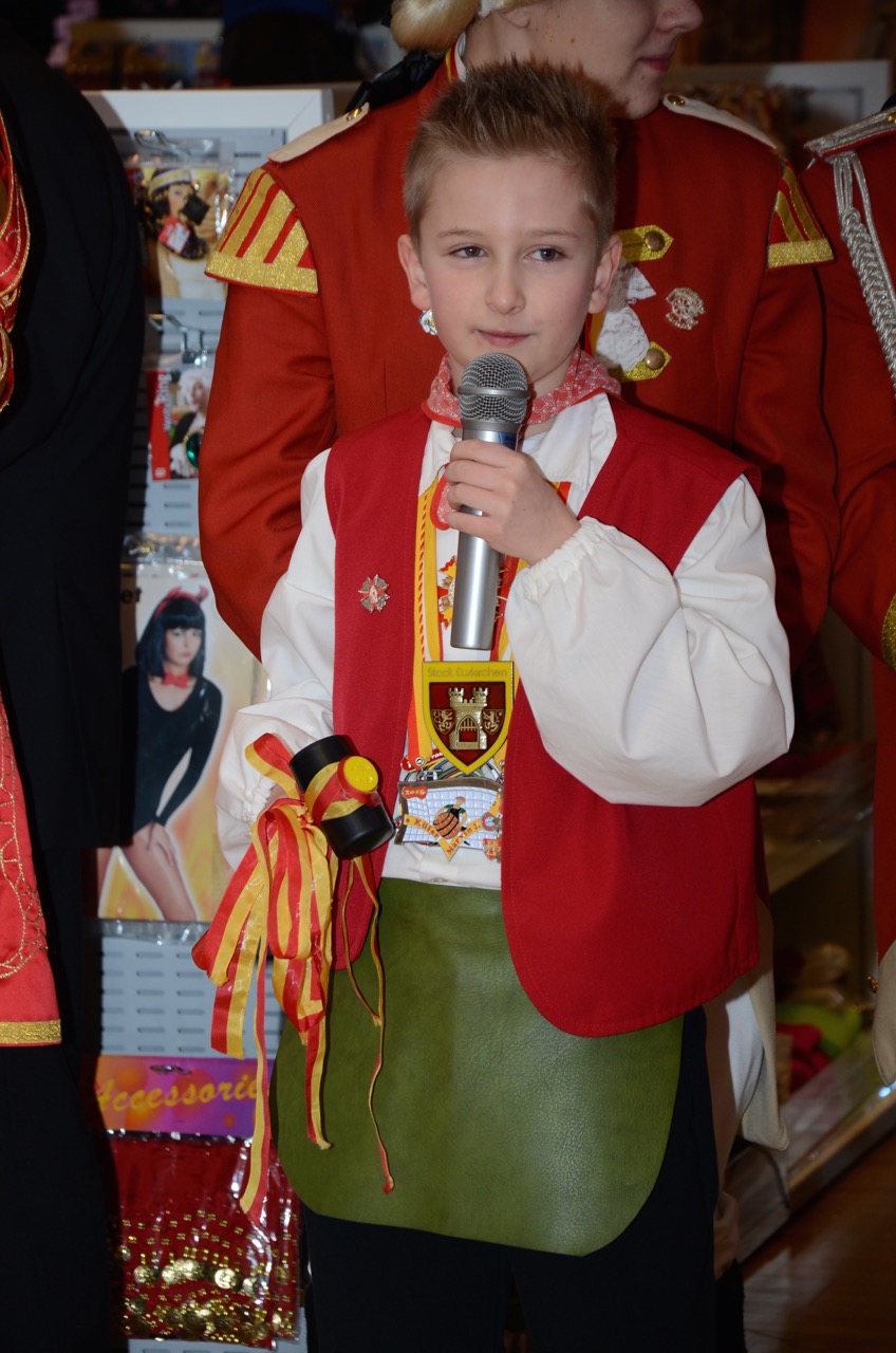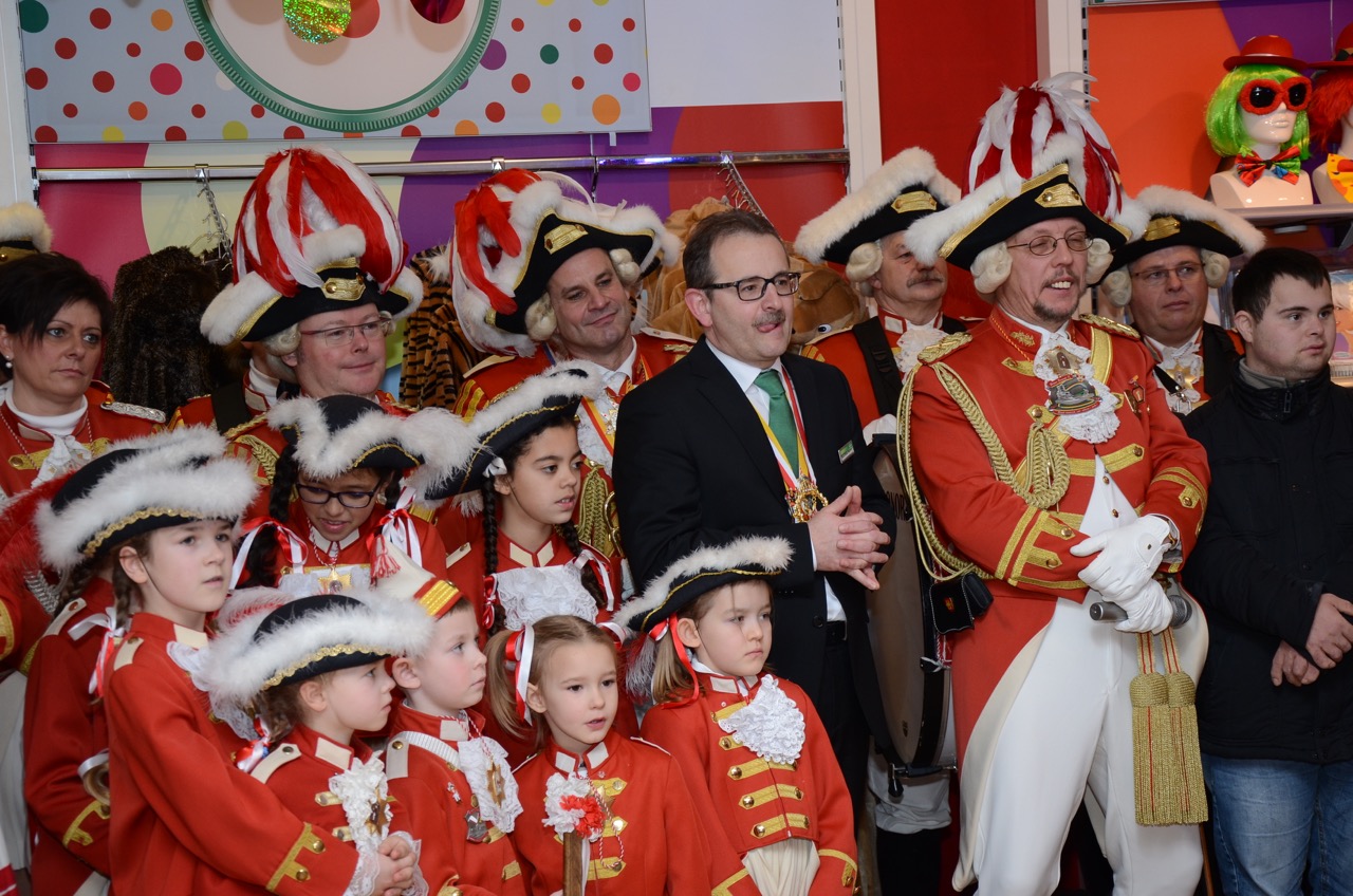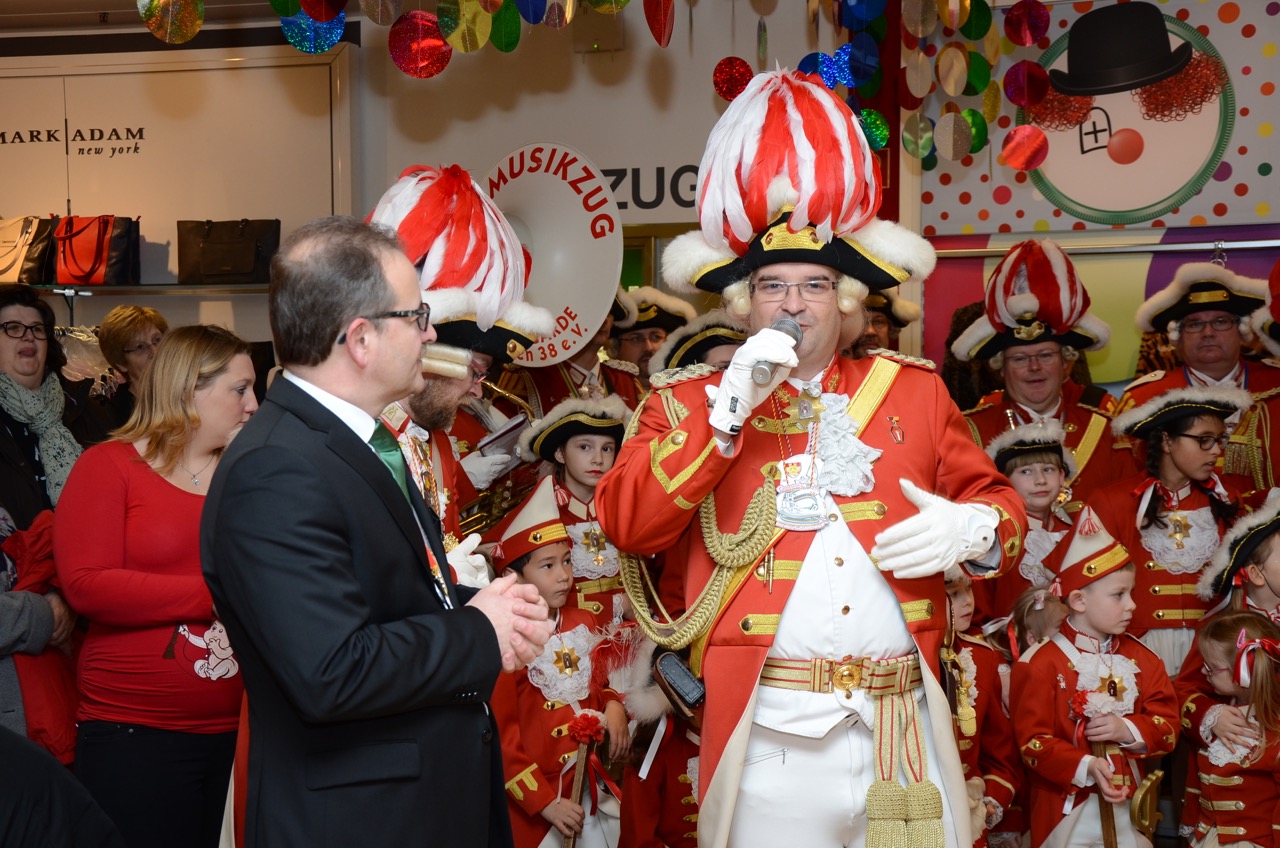 23.01.2016, 11:30 Uhr: Die Prinzengarde zieht mit großem Gefolge in den Kaufhof Euskirchen ein. Grund des Besuches war der Galleria Kaufhof, speziell natürlich den Menschen die dort arbeiten, Danke zu sagen. Danke für eine großzügige Spende an die Prinzengarde. Alle Formationen der Prinzengarde waren mitgekommen. „Das ist schon eine stattliche Anzahl an Gardisten“ stellte die Geschäftsleitung mit Freuden fest. Nach dem Tanz von unserem Knübbelchen und dem obligatorischen „Stippeföttche“ rundeten die PG Girls den Besuch bei der Galleria Kaufhof ab. Vizepräsident Markus Tews verlieh der Geschäftsleitung den Sessionsorden der Prinzengarde. Zur Erinnerung an unseren Besuch wurde vor dem Haupteingang noch ein Foto mit allen Prinzengardisten und der Geschäftsleitung der Galleria Kaufhof geschoßen. Im Anschluß an unseren Besuch hatte die Galleria Kaufhof zu einem Imbiss geladen. Es ist schön, das es Firmen bzw. Unternehmen in Euskirchen gibt, die den Karneval in unserer Heimatstadt tatkäftig unterstützen. Nochmals Vielen Dank.
